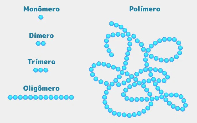- Monómero: molécula pequena, forma as cadeias principais do polímero e garante resistência final.